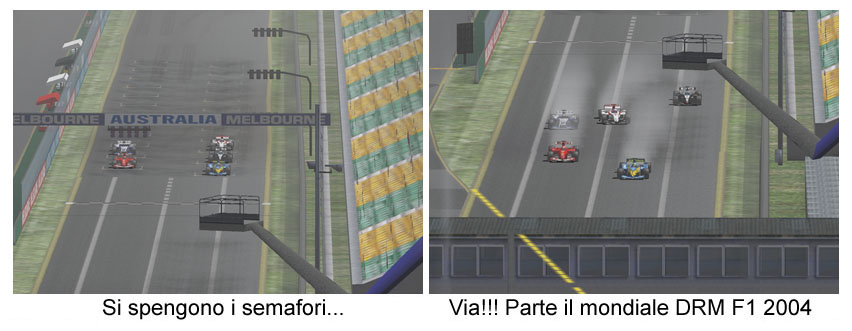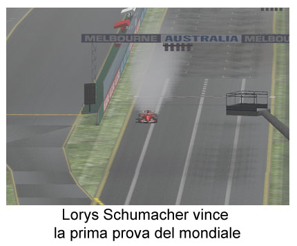 La prima prova del mondiale DRM F1 2004 si è svolta in Australia sotto una fitta pioggia, che ha tormentato Melbourne per tutto il weekend. Nelle prove libere Lorys Schumacher fa segnare il miglior tempo fermando il cronometro sull'1'37''996, secondo tempo per Thor Alonso, poi a seguire Tony Raikkonen, Xeno Schumacher e l'esordiente Crocco Button. A partire in pole però è Thor Alonso, seguito a meno di un decimo da Lorys Schumacher, seconda fila per Tony e Xeno, poi Crocco Button. Al via Aloso parte bene conservando la prima posizione mentre Tony Raikkonen è costretto a retrocedere in ultima posizione per l'inserimento involontario del limitatore di giri. Durante le prime fasi della gara Lorys Schumacher appare in affanno, commette due errori e viene prontamente infilato da Xeno e da Tony Raikkonen. "Ero un po' in difficoltà. La mancanza di visibilità mi ha innervosito, sono andato lungo due volte e sono stato superato" commenta il ferrarista. La pista è resa scivolosa dalla pioggia e anche Xeno Schumacher non è esente da errori. Tony e Lorys ne approfittano guadagnando una posizione a discapito del pilota Williams. Allo spagnolo della Renault invece, sembra andare tutto per il verso giusto, è in forma strepitosa e infila una serie di giri veloci che portano il distacco da Raikkonen a circa 25 secondi. Quest'ultimo, al 14° giro, dopo il difficoltoso doppiaggio di Crocco Button è costretto ad abbandonare la corsa per fine carburante. Davvero sfortunata la gara del pilota McLaren. Le posizioni restano le stesse anche dopo il pit stop con Thor Alonso saldamente al comando seguito a circa 35 secondi da Lorys Schumacher, poi Xeno Schumacher e Crocco Button. Crocco è in evidente difficoltà dato che il GP di Melbourne 2004 è la sua prima partecipazione in assoluto nel mondiale DRM, ed è anche protagonista di una tamponata che fa perdere una decina di secondi al leader della corsa Alonso. L'incidente per lo spagnolo è una sorta di presagio alla catastrofe che avverà a quattro giri dalla fine, momento in cui rompe i freni anteriori e in evidente difficoltà di controllo della vettura, tocca i muretti rompendo entrambi gli alettoni. Disperato, torna ai box, i meccanici riparano gli alettoni ma per i freni non c'è nulla da fare, lo rimandano in pista ma è costretto ad abbandonare il sogno di ripetere il successo dello scorso anno. Anche in casa Williams non c'è molto da gioire dato che Xeno Schumacher rompe i freni anteriori allo stesso giro. A tal punto Lorys Schumacher non deve fare altro che portare docilmente la macchina verso il traguardo e, anche se all'ultima tornata accusa lo stesso problema degli altri due piloti il vantaggio accumulato è sufficiente per concludere la corsa in prima posizione. Secondo a tagliare il traguardo Thor Alonso, terzo Xeno Schumacher e quarto Crocco Button.