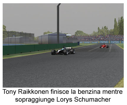 | Per tony: la benzina ti è finita a circa 35 secondi dal traguardo e 30 dai box con 3 curve da fare, no credo saresti arrivato a prescindere da qualsiasi perdita di tempo., ci volevano almeno 1,5 "litri" di benzina in più. L'errore della benzina l'ho fatto anch'io avrei cmq dovuto fare una mini sosta per finire la gara. Purtoppo però la sosta l'ho fatta ma per rimettere l'alettone posteriore! Sigh! |